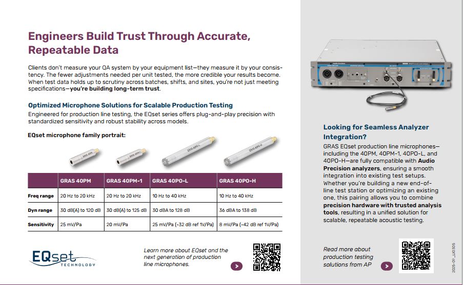 Tuotantolinjojen testauslaitteistojen ja mikrofonien tulee olla helppokäyttöisiä ja helppoja asentaa – eivätkä ne saa kuormittaa tuotantolinjaa seisokeilla ja viivästyksillä. GRAS on kehittänyt vaikuttavan valikoiman mikrofoneja ja testauslaitteita ääni- ja elektroniikkavalmistajille. Ne ovat kestäviä ja luotettavia ja tarjoavat tarkkoja mittauksia varmistaakseen, että kuluttajaäänituotteet, jotka eivät täytä spesifikaatioita, eivät päädy loppukäyttäjille.